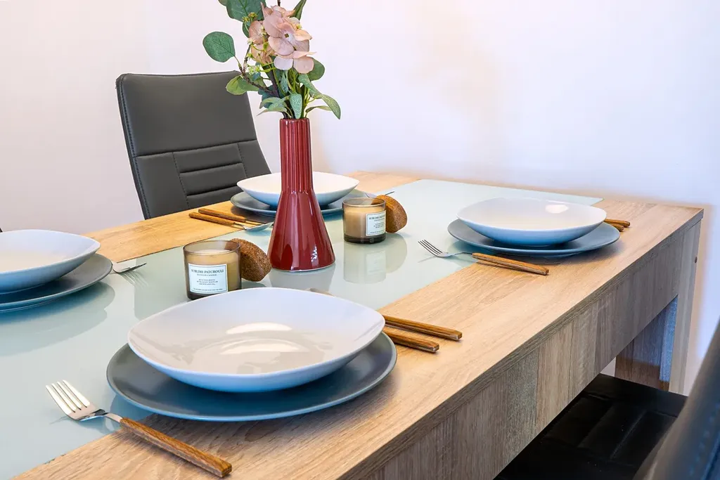 Byt disponuje kompletně zařízenou kuchyňskou linkou se všemi spotřebiči (sklokeramická deska, elektrická trouba, myčka, odsavač, mikrovlnná trouba, lednice), je klimatizován, což je velkou výhodou v horkých letních dnech, ale i v rámci přitápění v těch studených zimních. Vytápěn je pomocí plynového kotle, který stejně tak zajišťuje ohřev vody. Byt se pronajímá téměř kompletně zařízen nábytkem, který je součástí ceny za pronájem. V koupelně najdeme sprchový kout, toaleta je samostatná s vlastním umyvadlem.