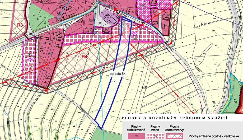Parcela č. 84 o výměře 9 724 m² leží částečně v ploše smíšené obytné venkovské (cca 1 800 m²), dále v územní rezervě plochy smíšené obytné venkovské (cca 1 200 m²) a ve zbývající části v ploše zemědělské (cca 6 724 m²). V západní části je navržena plocha pro koridor technické infrastruktury.