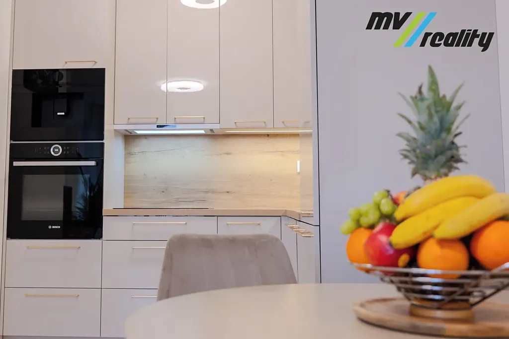 Kuchyň je vybavena nadčasovou kuchyňskou linkou se značkovými vestavěnými spotřebiči (sklokeramickou varnou deskou, troubou, myčkou nádobí a kávovarem - vše velmi málo používané).