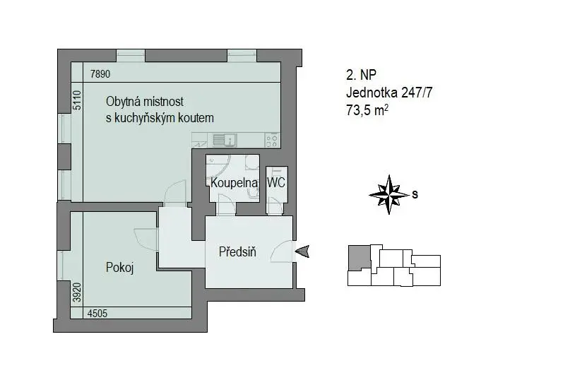 Dispozice: prostorná předsíň, obývací pokoj spojený s kuchyňským koutem a jídelnou, ložnice, koupelna se sprch. koutem, samostatná toaleta. Obývací pokoj lze stavební úpravou rozdělit a získat tak další místnost. Součástí kuchyňského koutu je prostorná kuchyňská linka s množstvím úložného prostoru a s vestavnými spotřebiči (trouba, indukční varná deska, myčka nádobí, odsavač par, led osvětlení). K bytu náleží kóje v suterénu o výměře 3,6 m2.
