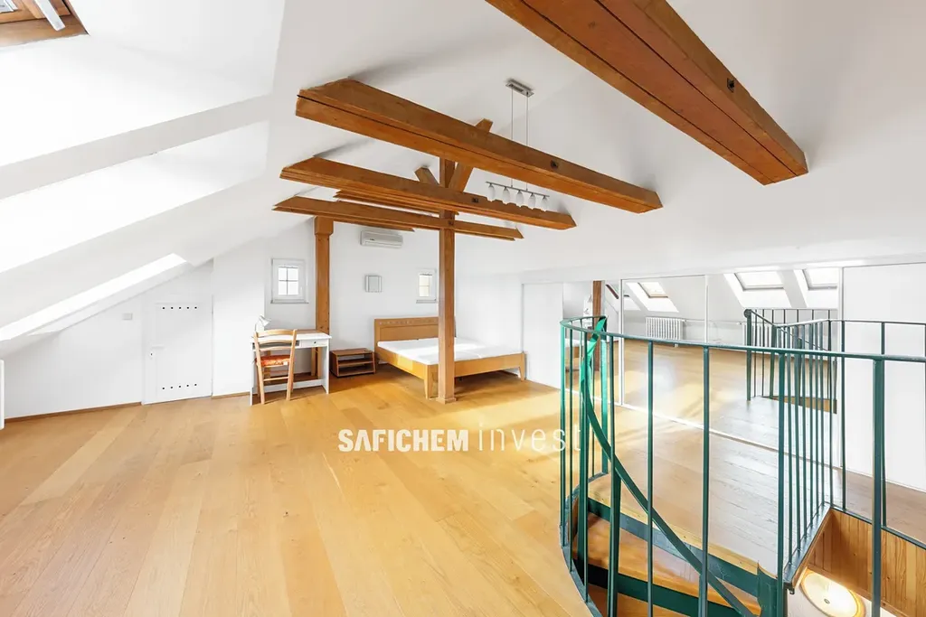 Po schodišti se dostanete do horního patra, kde je umístěn prostorný pokoj se střešními a menšími okny s krásným výhledem na Prahu. Tento prostor nabízí dostatek denního světla i soukromí a může sloužit jako ložnice, dětský pokoj či pracovna.