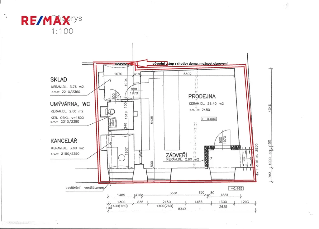 Dispozice: zádveří, prodejní prostor, kancelář, sklad, sociální zařízení. Nemovitost (samotné prostory) nebyla povodní, jakkoliv zasažena.