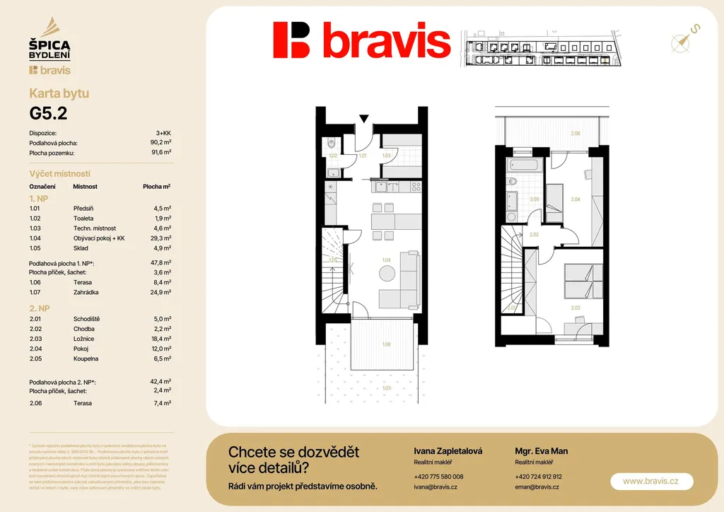 Tato výjimečná bytová jednotka o dispozici 3+KK (G.5.2) je umístěna ve viladomě G 5, kde jsou celkově pouze 3 bytové jednotky. Celková podlahová plocha bytu je 90,2 m². K bytu náleží dvě terasy: 7,4 m² a 8,4 m² a zahrádka s výměrou 24,9 m².