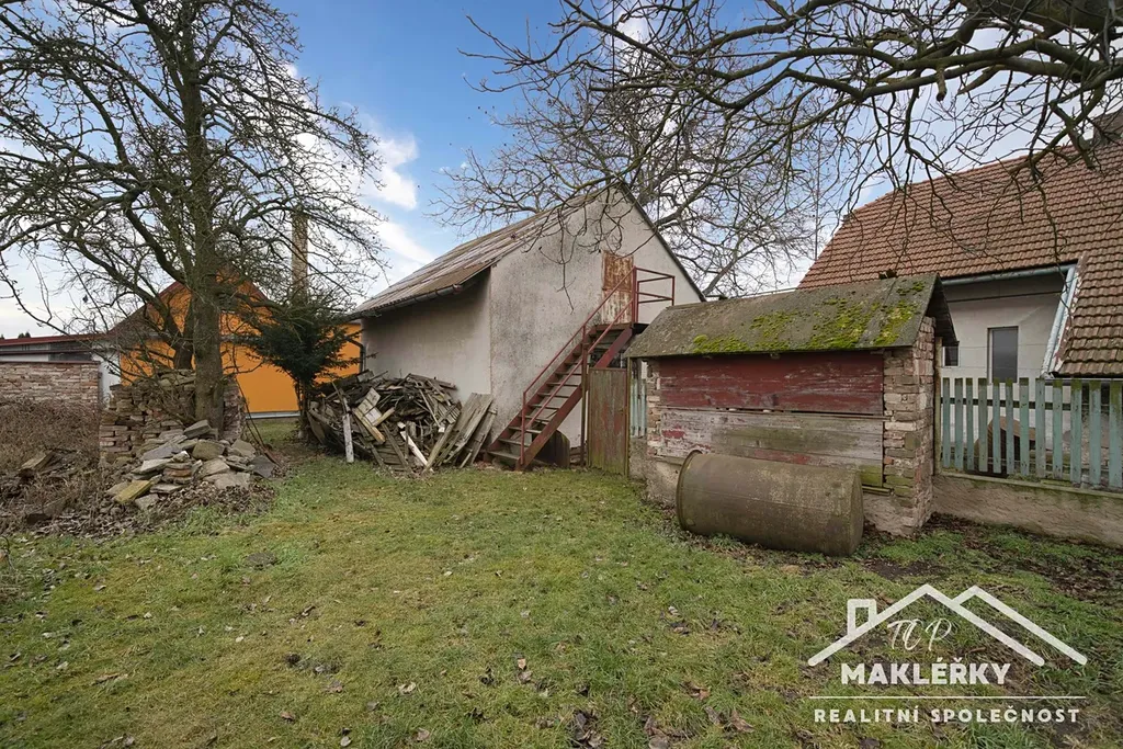 Plot kolem pozemku je kovový, s betonovou podezdívkou. U domu je předzahrádka, propojena kovovými dvířky s velkou zahradou. Tam rostou ovocné stromy a prostor lze využít variabilně. V zadní části domu je i prodlouženou střechou zbudovaný přístřešek s dveřmi, využívaný jako kůlna. Co se týká přípojek- elektřina je původní v hliníku, k domu přivedena vzduchem, sloup je na hranici pozemku. Obec se připravuje k zapravení do země během 2 let. Kanalizace je přivedena cca 10 let. Plyn není. Voda je čerpána ze studny, umístěné v přední části pozemku a druhá studna je za domem, cca 15 let nevyužívaná. Čerpala se z ní užitková voda. Obecní voda je přivedena k pozemku do vybudované šachty a je zaslepená. Lze využít.