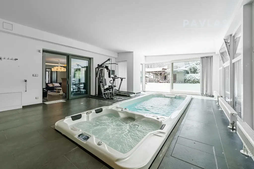 Výjimečnost této nemovitosti podtrhuje soukromé wellness centrum. Přímý vstup na terasu je zajištěn nejen z wellnessu, ale také z obývacího pokoje a dolní ložnice, takže si maximální pohodlí a propojení s exteriérem užijete opravdu v každé situaci. Součástí wellness je vyhřívaný bazén s protiproudem, jacuzzi i autentická finská sauna. Chvíle zde se změní v každodenní zážitek absolutní relaxace.