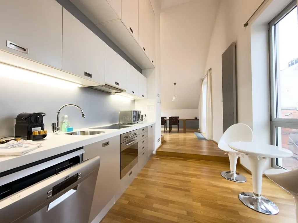 Nabízíme k pronájmu kompletně zařízený byt o dispozici 2+kk a velikosti 107 m² s terasou, umístěný ve 4. nadzemním podlaží v domě bez výtahu. Je situován v posledním patře a poskytuje bydlení s důrazem na prostor, světlo a atmosféru historického centra města.Dominantou bytu je prostorný obývací prostor s plně vybavenou kuchyní, který doplňuje krátké schodiště vedoucí přímo na terasu s výhledem na Hradčany přes střechy okolních domů. Dispozice dále nabízí ložnici se vstupem do koupelny se sprchovým koutem a technickou místnost s menší šatnou. Velká okna, včetně střešních, zajišťují dostatek denního světla po celý den. Součástí vybavení je klimatizace v obývacím pokoji i ložnici.Nemovitost se nachází v klidné ulici v samotném centru Starého Města. Veškeré historické centrum Prahy je v docházkové vzdálenosti, včetně nábřeží Vltavy a Letenských sadů, které nabízí ideální prostor pro procházky, relaxaci i sportovní aktivity.Dopravní dostupnost je vynikající. V blízkosti jsou tramvajové zastávky i stanice metra s rychlým spojením do všech částí města.Vedlejší poplatky činí 5 800 Kč měsíčně a zahrnují veškeré služby.