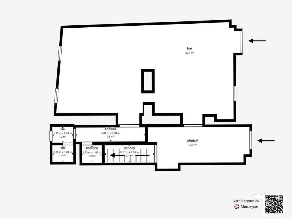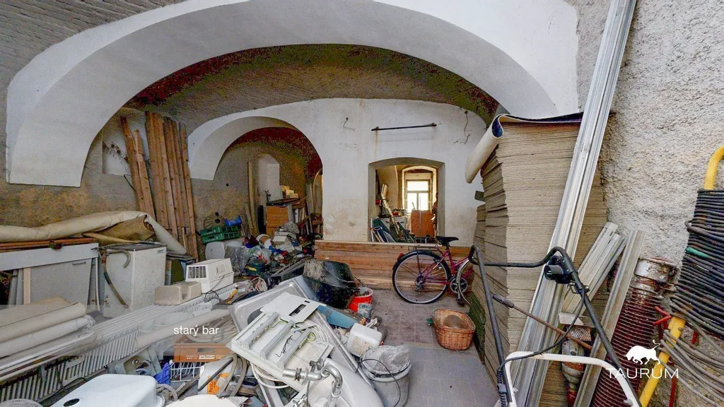 Přízemí domu o výměře 114 m² sloužilo v minulosti jako bar se sociálním zařízením. Sloup a přilehlé klenby jsou zde využity jako předělující prvek mezi jednotlivými zónami prostor. Nachází se zde ještě různý materiál, nicméně jeho vyklizení je vlastník nemovitosti připraven po domluvě případně zajistit.