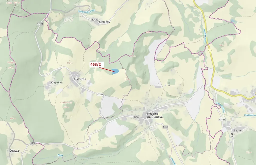 Lesní pozemek o výměře 10 638 m2, parcelní číslo 463/2, podíl 1/1, katastrální území Ostružno na Šumavě, obec Nezdice na Šumavě, obec s rozšířenou působností Sušice, okres Klatovy, Plzeňský kraj.