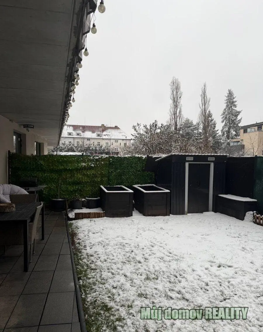 Součástí bytu je soukromá předzahrádka o velikosti 66,8 m, která nabízí zahradní posezení, vířivku, zahradní domek a gril ideální místo pro odpočinek, rodinné chvíle i letní večery s přáteli.