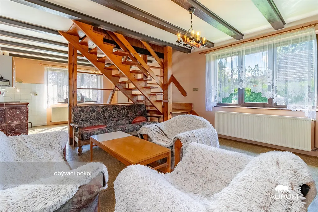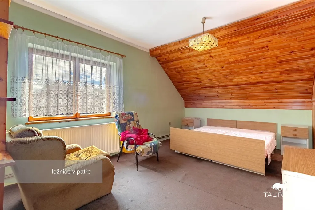 V patře jsou 2 pokoje, podkrovní komora, a vstup na půdu (po žebříku).