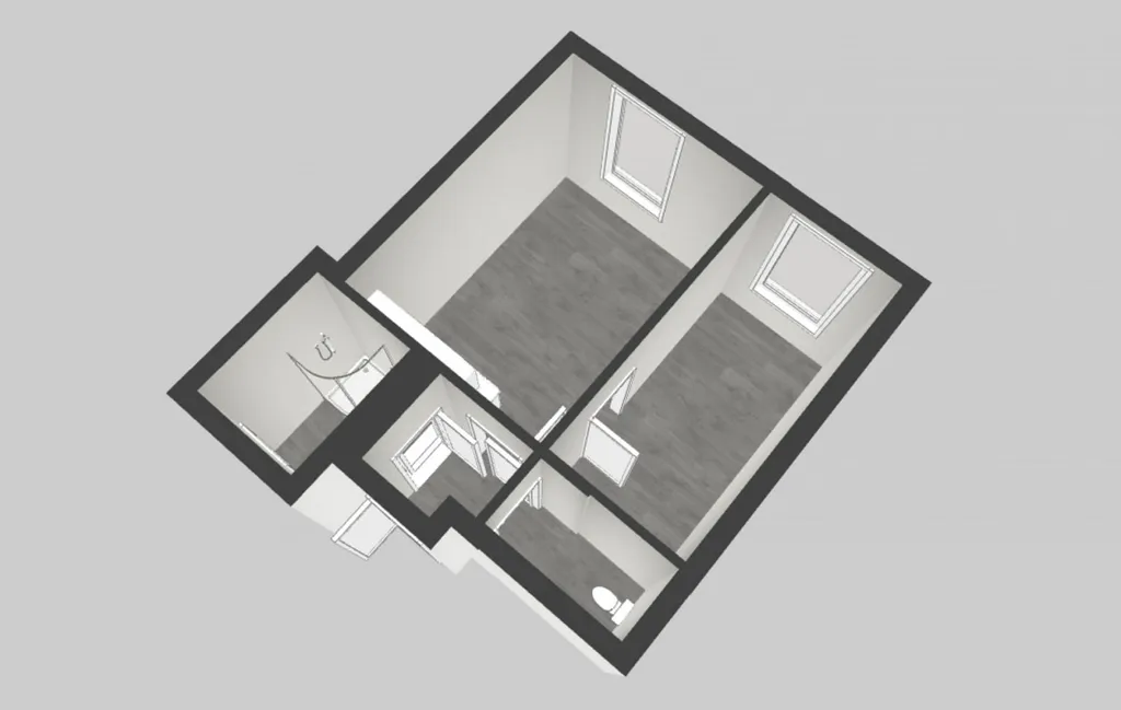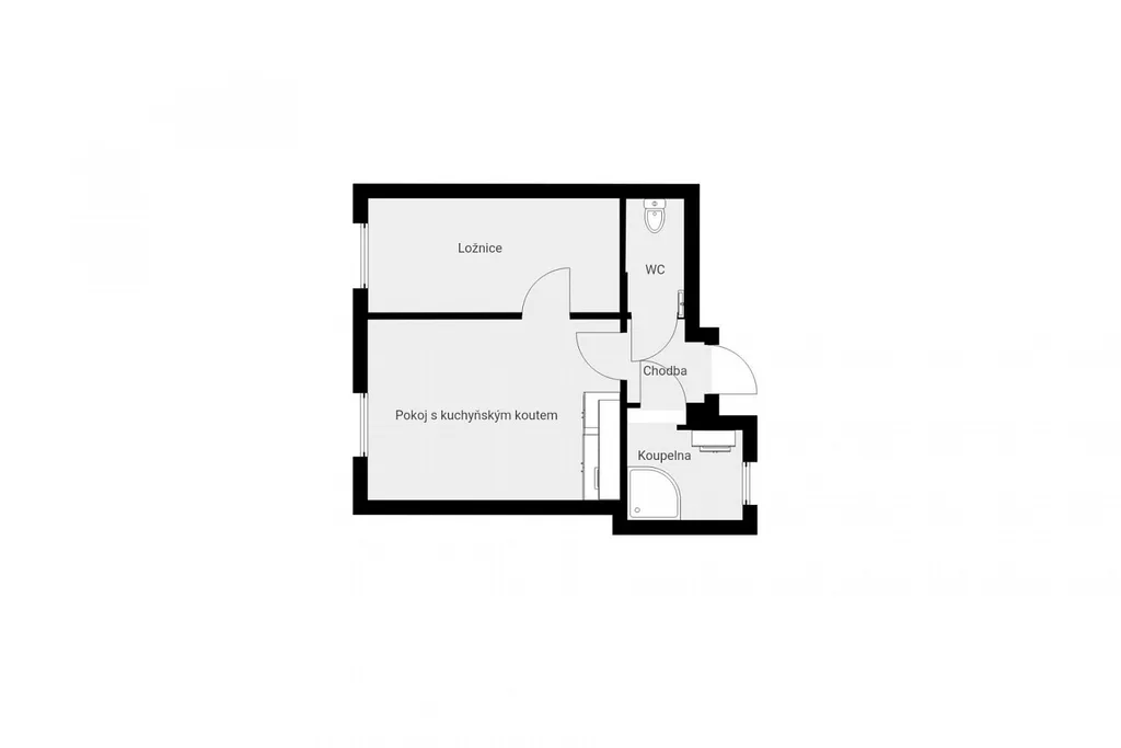 Byt tvoří vstupní chodba, obývací pokoj s kuchyňskou linkou, ložnice, koupelna a samostatné WC. I přes svou kompaktní velikost nabízí velmi praktické uspořádání vhodné pro jednotlivce nebo pár.