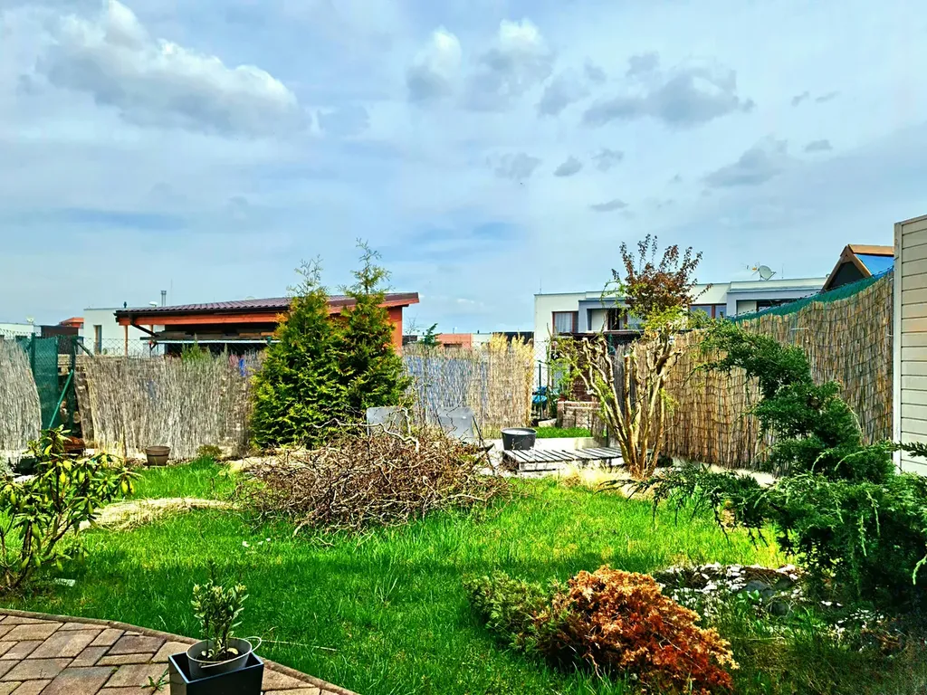 Přízemí: Dominantou je prosluněný obývací pokoj propojený s plně vybavenou kuchyní a jídelnou, odkud je přímý vstup na zahradu o výměře 91 m² – ideální velikost pro relaxaci bez nutnosti náročné údržby. Dále zde najdete koupelnu se sprchovým koutem a praktickou technickou místnost (místo pro pračku, sušičku i úložné prostory). Samozřejmostí je přímý vstup do vlastní garáže.