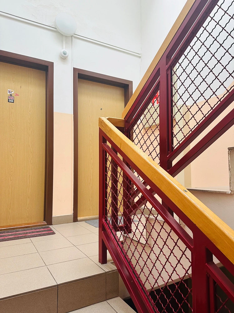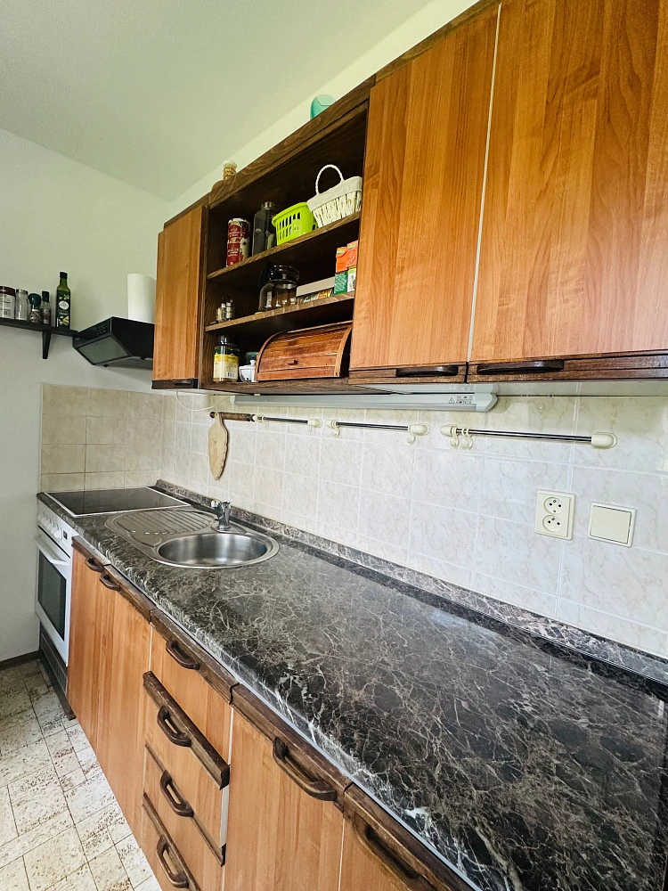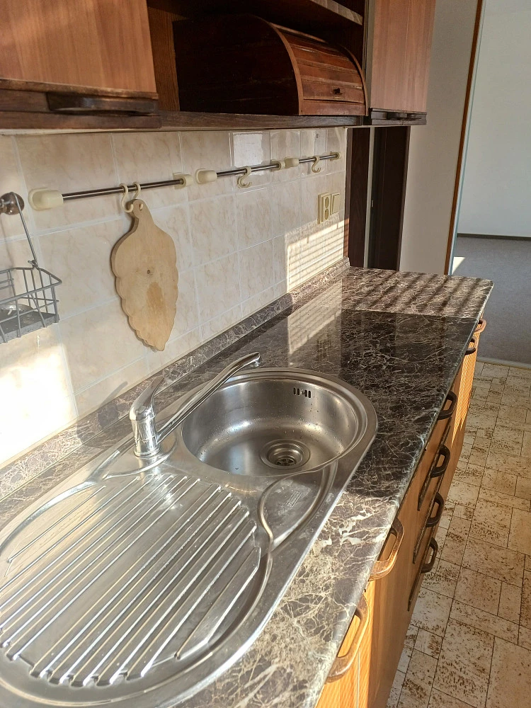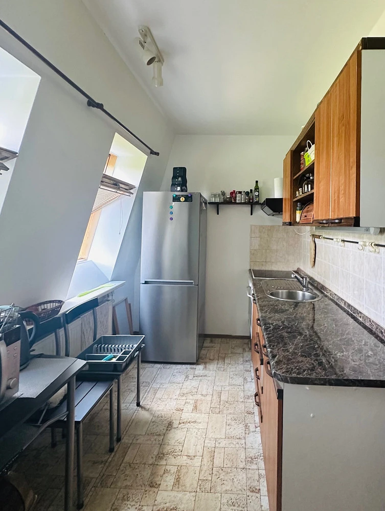 Obývací pokoj (24 m²) je řešen dvěma vstupy - lze rozdělit na obývací a odpočinkovou část, která je vybavena praktickou vestavěnou skříní větších rozměrů / mini šatna. Současně pokoj navazuje na samostatnou malou kuchyňku (7 m²) - posuvné dveře; vybavena rovnou kuchyňskou linkou včetně vestavěné sklokeramické desky a elektrické trouby, digestoře, spižní skříně - dvě střešní okna s žaluziemi. Koupelna je zařízena vanou 1.500 mm, přípojkou na pračku 600 mm, WC součástí. Uložné prostory - předsíňová šatní skříň s botníkem a věšákem; v přízemí domu najdete větší a zcela bezpečnou sklepní boji (3 m²). Součástí jsou svítidla v celém bytě, podlaha - koberec (stáří 5 let) v kombinaci s PVC a keramickou dlažbou, čistá bílá výmalba, garnyže. Jednoznačnou výhodou jsou zcela prokazatelné spotřeby energií s přesným každoročním vyúčtováním záloh. Úklid společných prostor domu (sušárna a kočárkárna) je zajištěn domovníkem, po celý den dostupné parkování přímo před domem. Slušná a stálá klientela domě.
