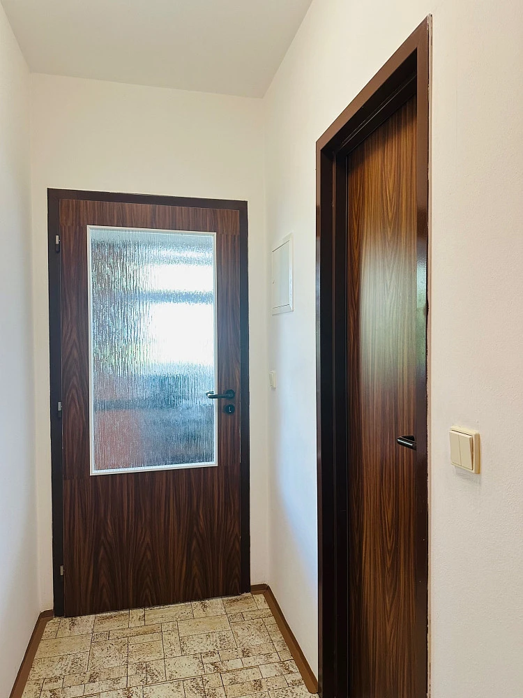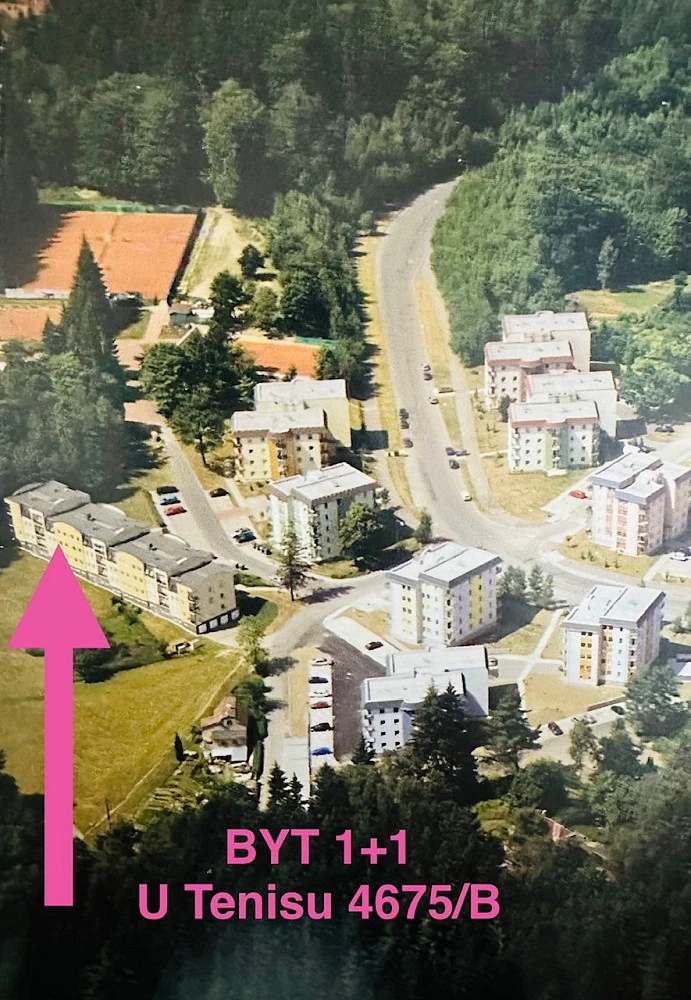 Dlouhodobý pronájem slunného podkrovního bytu 1+1 (42 m²) v posledním podlaží menšího bytového domu - vchod pouze s 12 byty, bez výtahu - 40 schodů. Jedná se o dům na samotném okraji místní zástavby / dokončen říjen 2001 - přímý výhled do lesa a louky - mimo příjezdovou dopravní komunikaci, mimo parkoviště - orientace jihovýchod.