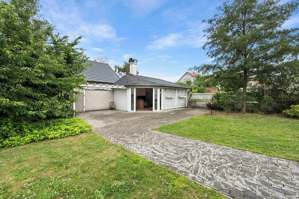 Na parcele se kromě hlavní stavby rodinného domu nachází i prostorné nezastřešené parkoviště (například pro karavan, velké auto nebo pro návštěvy). Pro majitele domu je parkování řešeno v prostorné garáži (2 velká auta) s vraty na elektronický pohon. Vzadu za domem je pergola a zděný altán se zabudovanou pecí a grilem, kde můžete posedět s přáteli i za chladnějších večerů. V letních měsících lze rolety zcela vysunout a dopřát si tak nerušený výhled na zadní část zahrady.