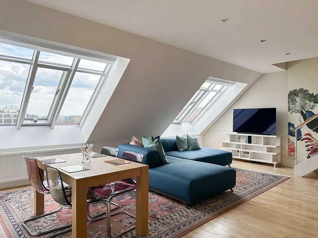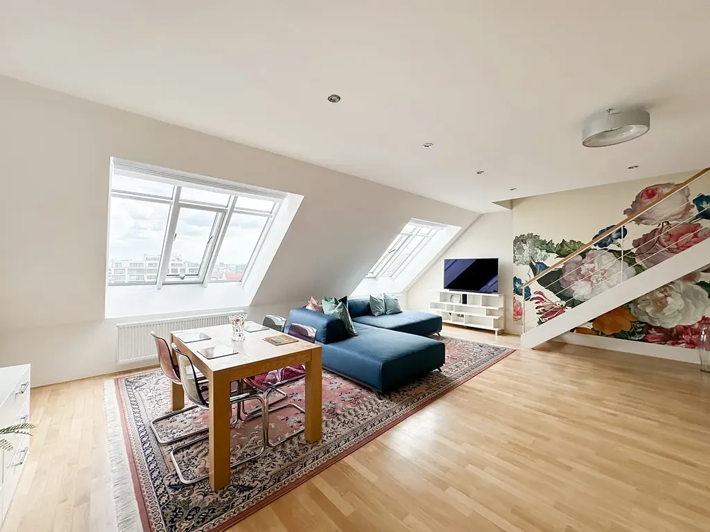 Pronájem krásného a plně vybaveného mezonetu 3+kk v srdci Vinohrad, ulice Boleslavská 7. Tento prostorný mezonet se nachází v 6. patře a má celkovou plochu 114 m².