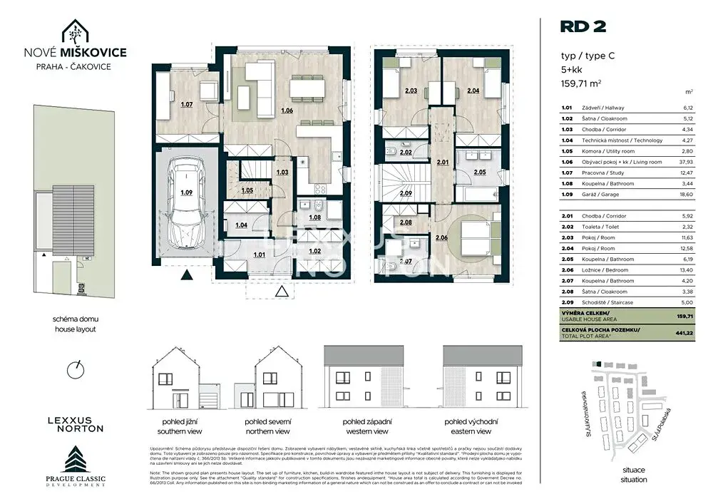 Nabízíme k prodeji prostorný rodinný dům o dispozici 5+kk v rezidenčním projektu Nové Miškovice, který vyniká velkorysou užitnou plochou 159,71 m² a vlastním pozemkem o velikosti 441,22 m². Dispozice domu je navržena s důrazem na pohodlný rodinný život, dostatek soukromí a přirozené propojení interiéru se zahradou.