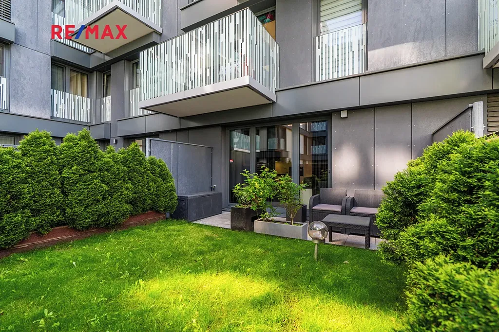 Velkoformátová okna zajišťují dostatek denního světla a zároveň přímý vstup na zatravněnou předzahrádku orientovanou do vnitrobloku, která nabízí příjemné soukromí a možnost relaxace či venkovního posezení.