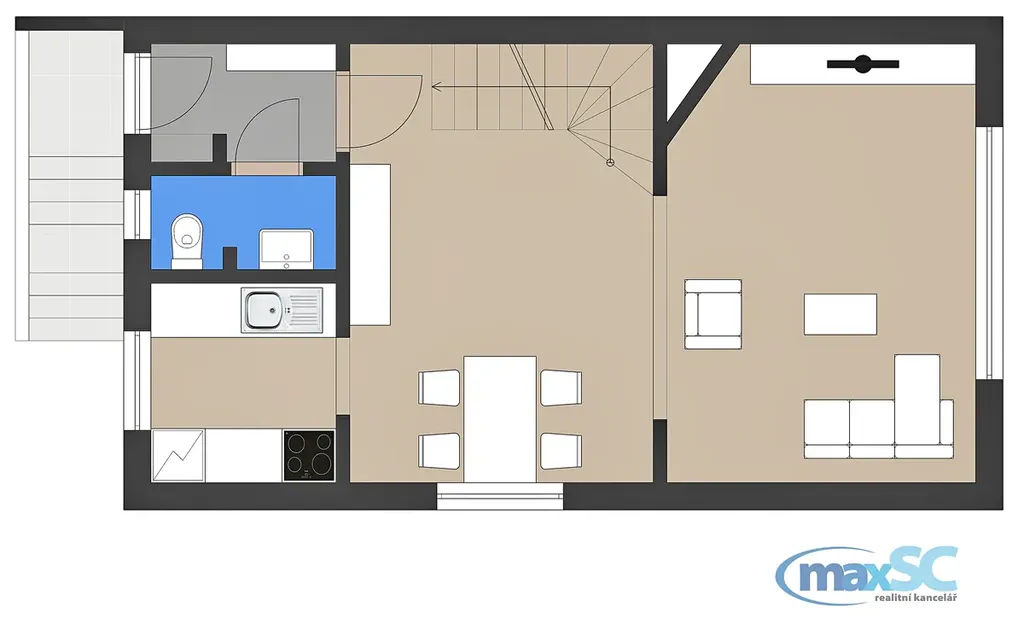1. nadzemní, kde je umístěn vchod do obytné části, s chodbou WV, malou kuchyňkou a prostorným obývacím pokojem s jídelnou