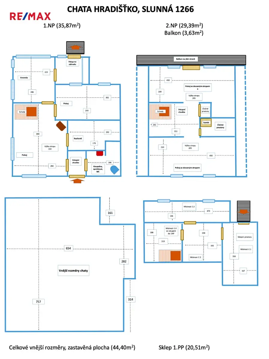 Chata je z velké části podsklepena (1PP – 20,5m2) masivní konstrukcí (beton, žula, kameny). 4 sklepní místnosti. El. 220/380 V,