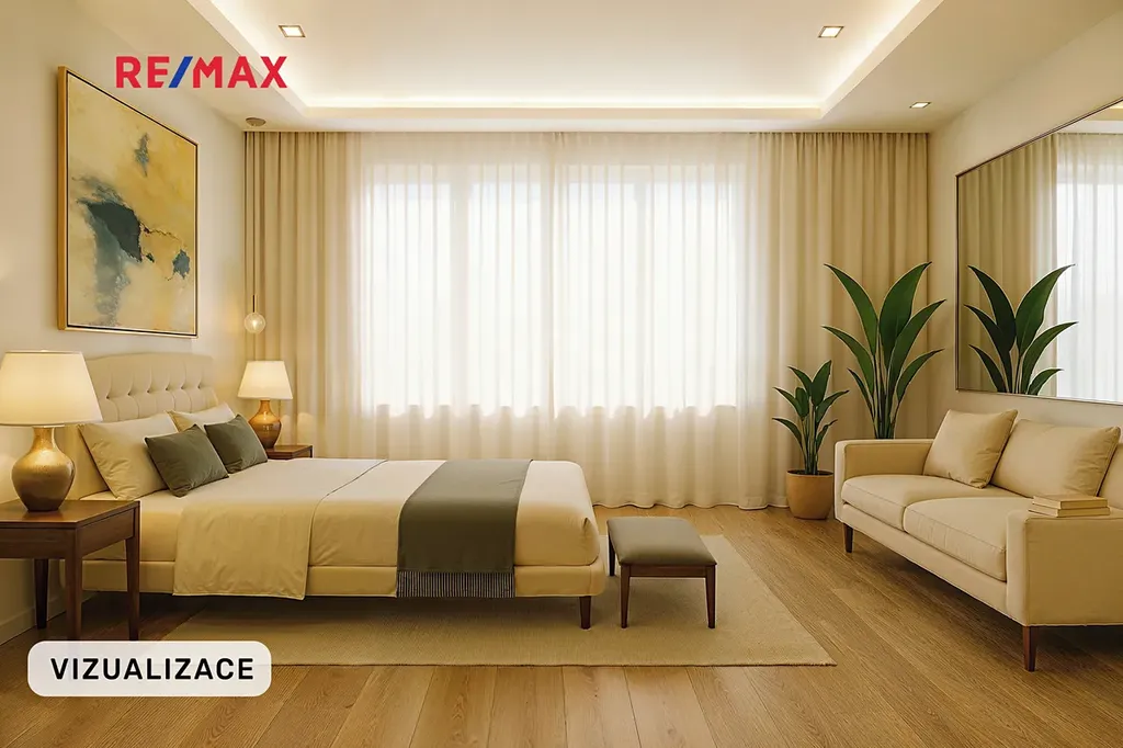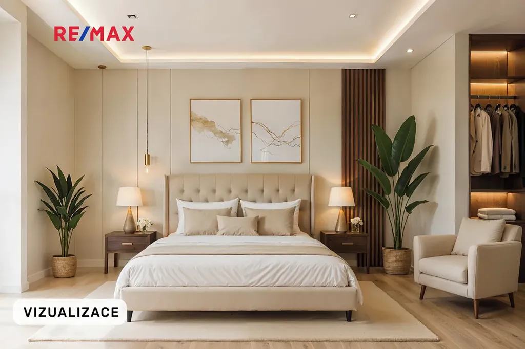 - hlavní ložnice se šatnou a soukromou koupelnou (sprchový kout, WC)