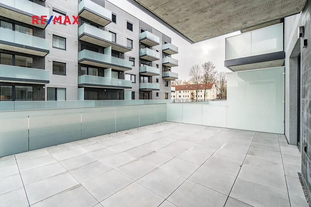 Byt je umístěn v 1.NP s výhledem do vnitrobloku. Budova má v úrovni terénu garážová stání a nad nimi je teprve 1.NP, tedy v jiné budově by označení podlaží bytu bylo v 2.NP.