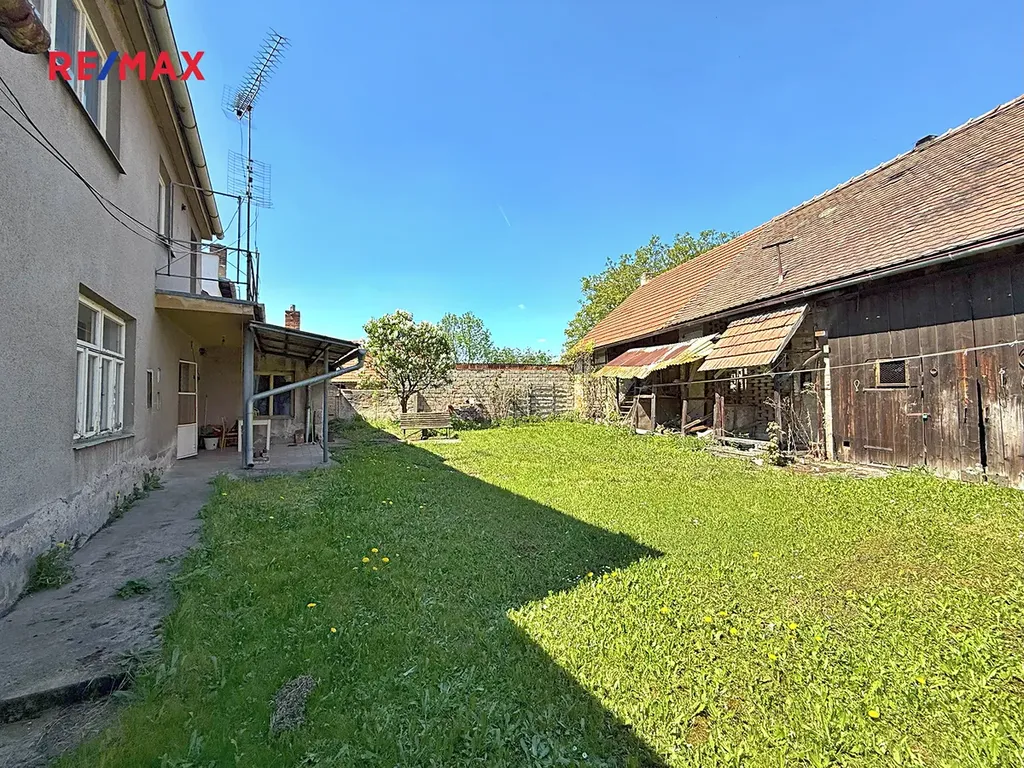 V příjemném vnitrobloku mezi rodinným domem a stodolou, kam je možné se dostat i automobilem průjezdem v domě, máte naprosté soukromí. Za stodolou se rozprostírá krásná zahrada o rozloze více než tisíc metrů čtverečních, ideální pro pěstování ovoce a zeleniny, trávení volného času či jako místo pro dětské hry. Hned za zahradou je chovný rybník vybízející k chytání ryb.