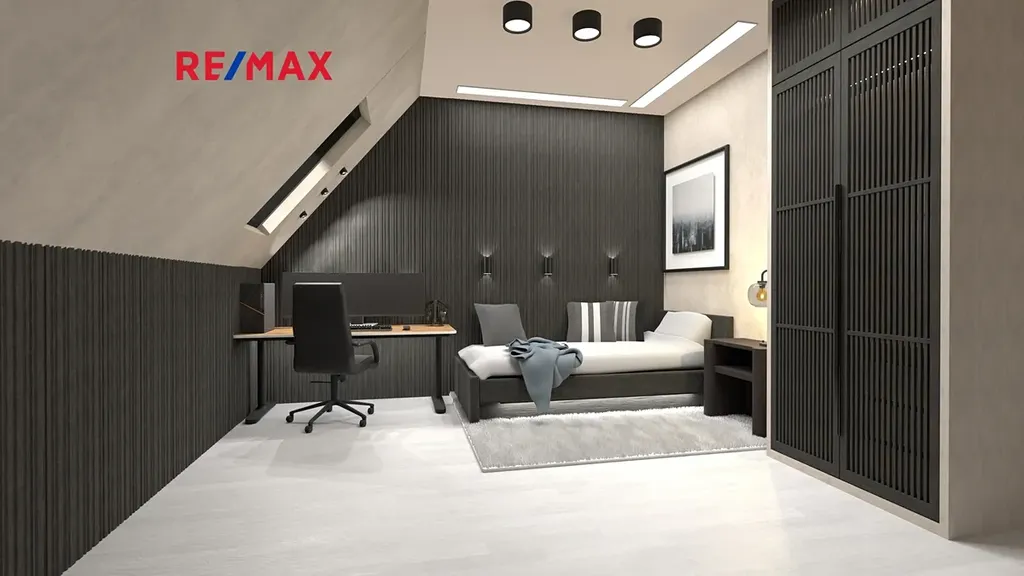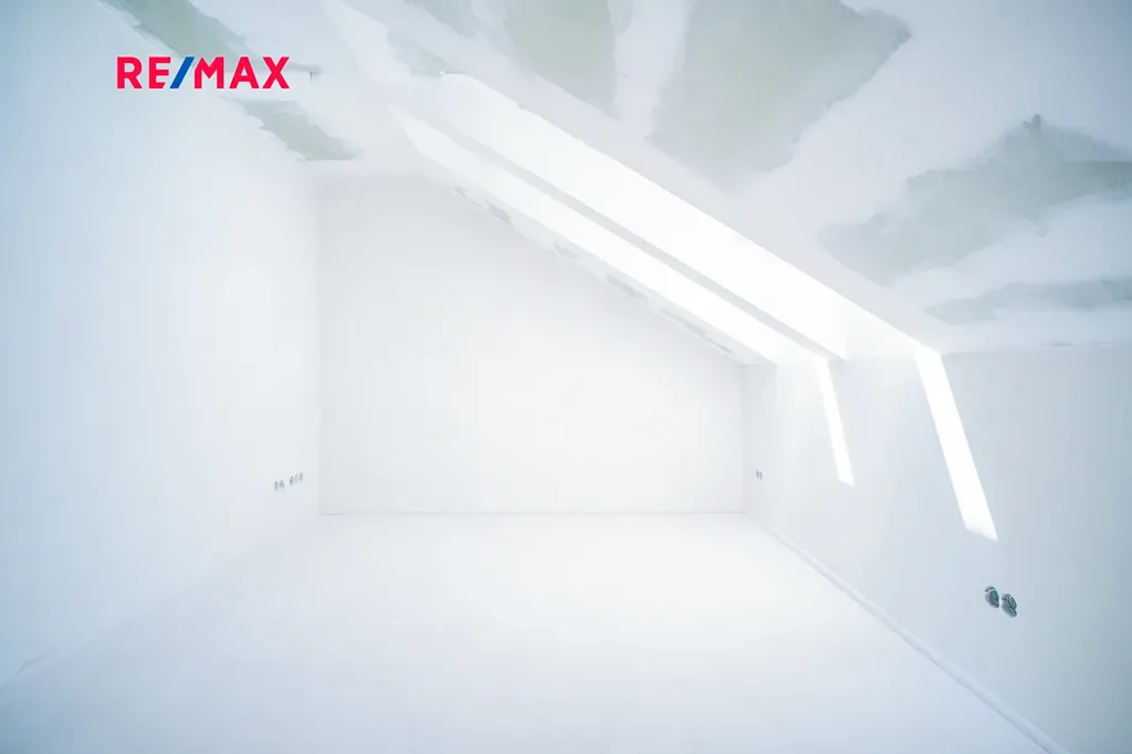 V patře najdete dětský pokoj, prostornou hlavní ložnici a koupelnu. Interiér je prosvětlený díky designovým střešním oknům, které dodávají místnostem příjemnou atmosféru. Celý pozemek je oplocen a zelená stěna v zahradní části zajišťuje dostatek soukromí. K domu náleží dvě vlastní parkovací místa přímo před vchodem.