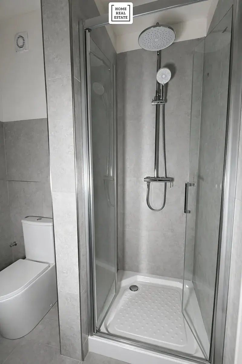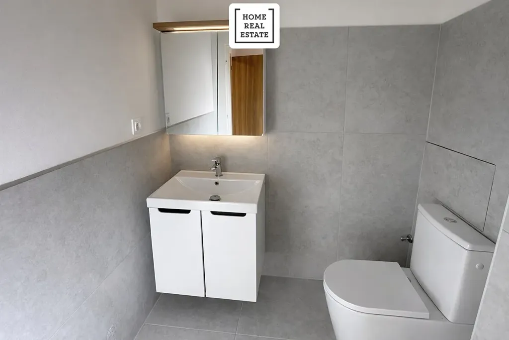 Koupelna je řešena v moderním designu s důrazem na funkčnost a hygienu. Součástí je celokapotované WC s duálním splachováním (3/5 l) a sedátkem Soft Close. Umyvadlová skříňka s umyvadlem nabízí praktický úložný prostor, doplněná o zrcadlovou skříňku s LED osvětlením a zásuvkou 230 V. Sprchový kout je vybaven exkluzivním sprchovým systémem od švýcarského výrobce s hlavovou sprchou o průměru 250 mm a ruční sprchou se třemi funkcemi, poskytující komfort tropické sprchy. Obklady a dlažby jsou ve formátech 60 × 60 cm a 60 × 120 cm, v imitaci kamene s matným povrchem a výraznou kresbou, která dodává koupelně nadčasový vzhled. V koupelnách je instalováno teplovodní vytápění, které zajišťuje příjemný tepelný komfort a rovnoměrné sálavé teplo.