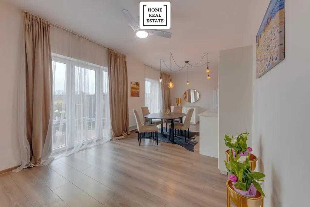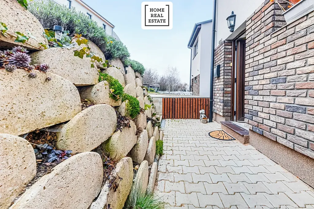 Obývací pokoj s kuchyňským koutem a spižírnou nabízí přímý vstup na terasu se zahrádkou. Master ložnice má vlastní sociální zařízení s WC, sprchovým koutem a umyvadlem. Dům má dále dvě dětské ložnice. Zahrada a terasa poskytují dostatek soukromí a nádherný výhled na hory Říp a Milešovka.
