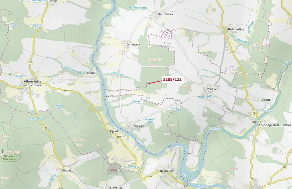Lesní pozemek o výměře 1942 m2, parcelní číslo 3288/122, podíl 1/1, katastrální území Hosty, obec Hosty, obec s rozšířenou působností Týn nad Vltavou, okres České Budějovice, Jihočeský kraj. Částečně po těžbě.