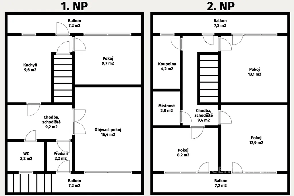 1. NP (přízemí): Světlý obývací pokoj (16,4 m²), kuchyně (9,6 m²), pokoj (9,7 m²), WC (3,2 m²) a předsíň. Z obou stran podlaží jsou k dispozici balkony (každý 7,2 m²).