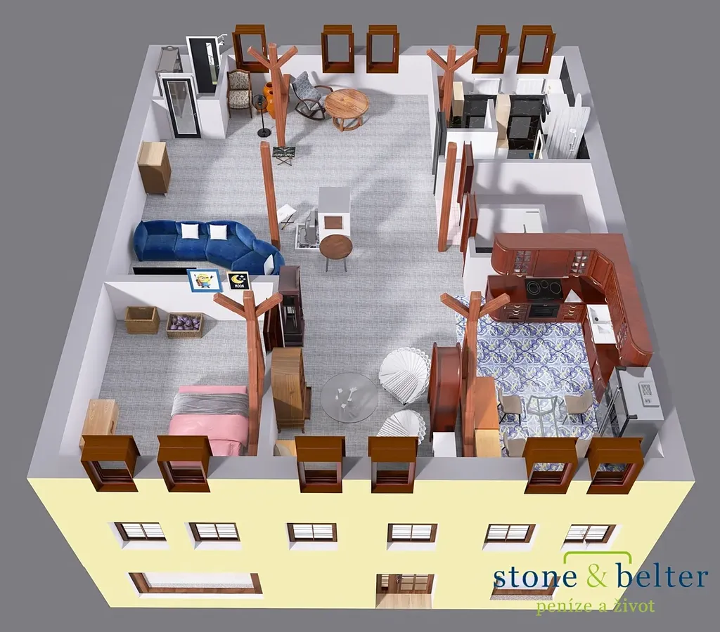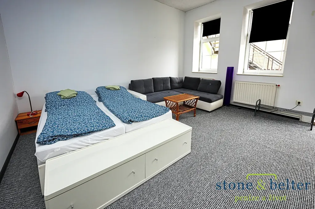 - byt 1+1 (obývací pokoj - 46 m2; kuchyň - 26 m2; koupelna + 2 WC - 13 m2)