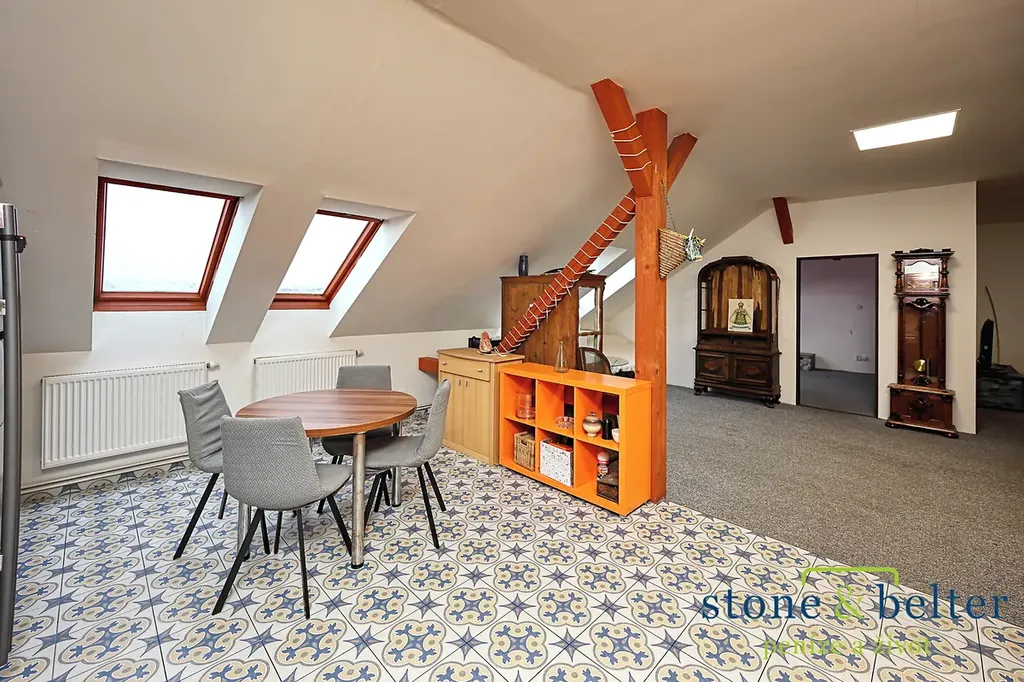 - byt 2+kk (obývací pokoj s kuchyňským koutem - 107 m2; ložnice - 18 m2; sklad - 12 m2; šatna - 3 m2; koupelna a WC - 17 m2)