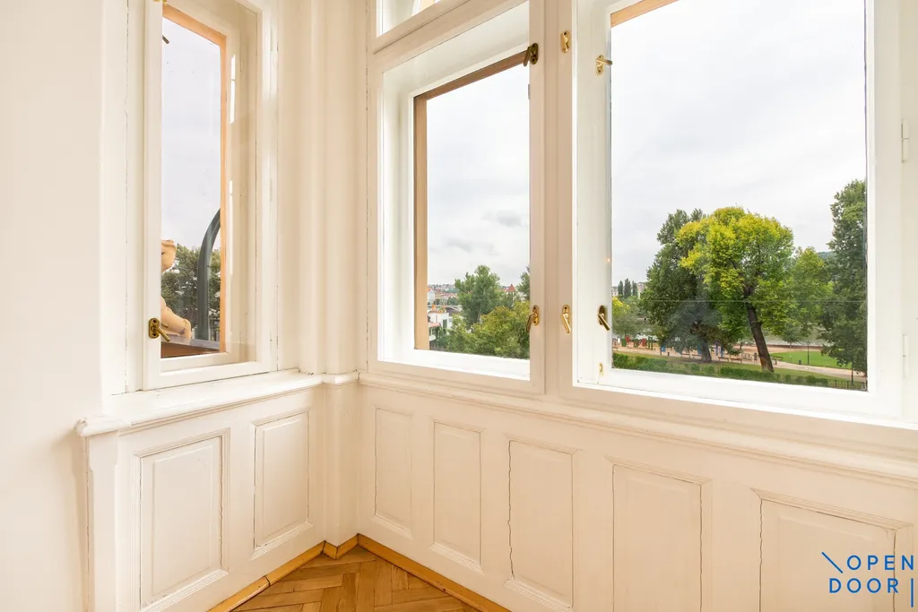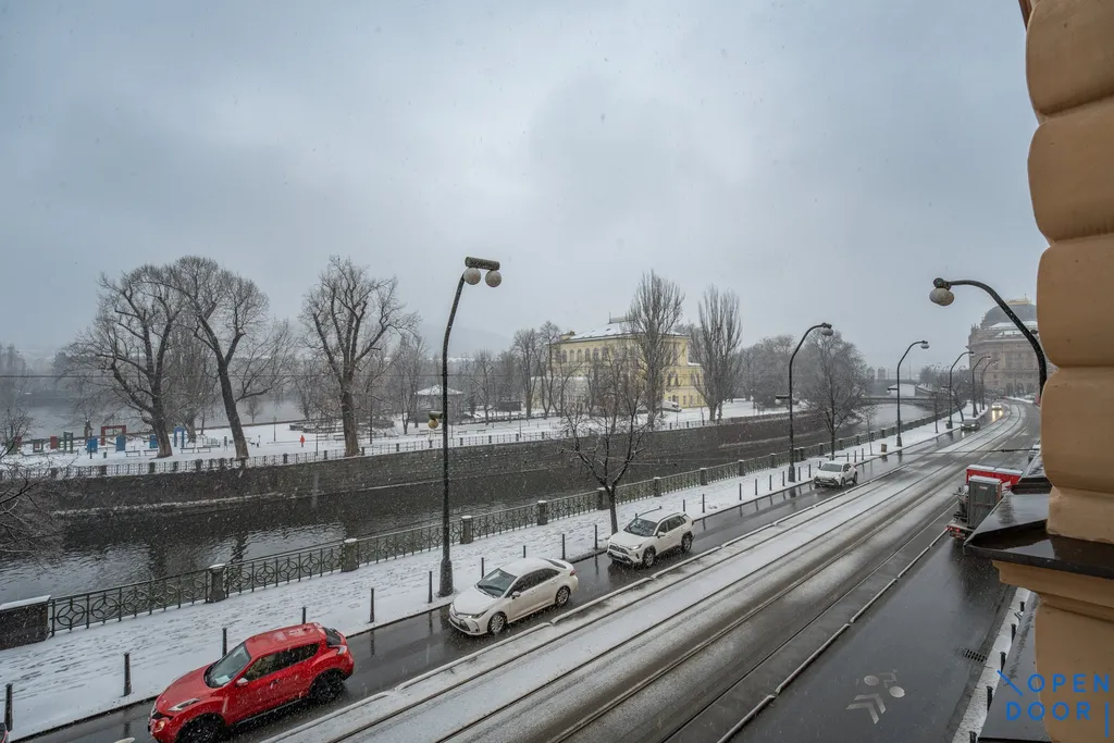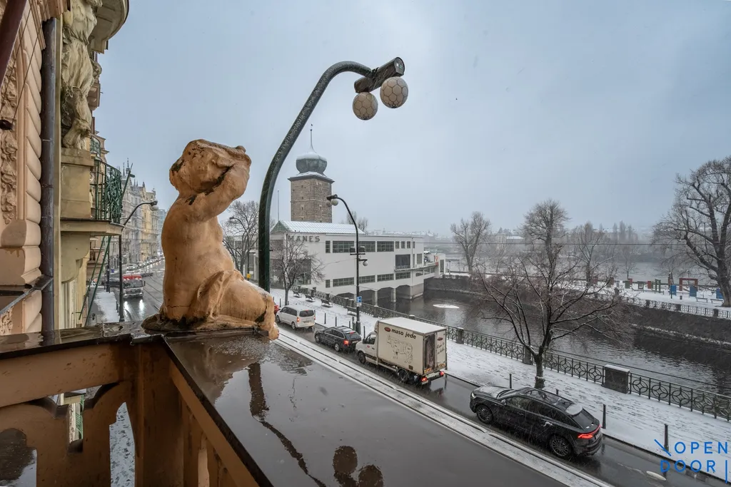 Prodej bytu 3+1, 100 m2, s balkonem a zimní zahradou na Masarykově nábřeží, Praha 1 – Nové Město, v prvním patře stylového pražského domu s nádherným výhledem na Prahu.