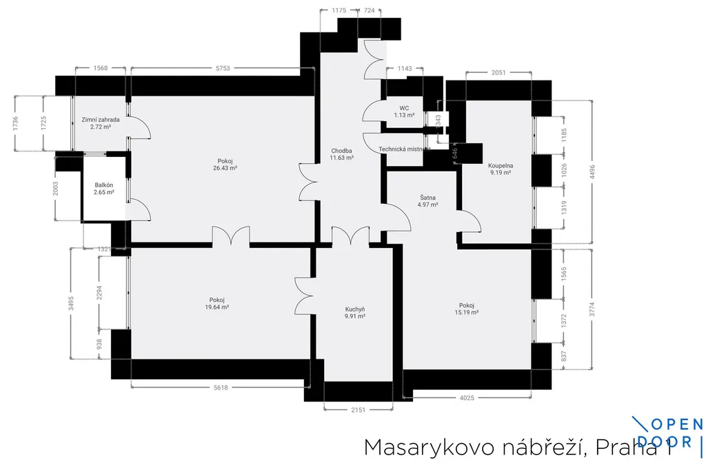 Byt je situován napříč domem, z prostorné vstupní haly je po pravé straně vstup do dvou velkých reprezentativních pokojů směřujících k Vltavě. Větší navazuje na zimní zahradu a je z něj možné vstoupit na malý balkon. Druhý z pokojů je přístupný i z kuchyně. Oba pokoje je možné propojit dvoukřídlými dveřmi. Pohled z oken na Vltavu se Žofínem, budovu Mánesa, Tančící dům a Národní divadlo je krásný. Protilehlá ložnice směřuje do klidného vnitrobloku, má vlastní šatnu a navazuje na velkou koupelnu vybavenou vanou, sprchovým koutem a toaletou. Za chladných dnů je možné využívat elektrické podlahové topení a topný žebřík. Z předsíně vlevo od vchodu do bytu je přístupné druhé samostatné WC a technická místnost s novým kombinovaným plynovým kotlem pro topení a ohřev vody v bytě, je v ní i přípojka na pračku. Z haly je také druhý vchod do kuchyně. Před třemi lety prošel byt částečnou rekonstrukcí (nové topení, rozvody elektřiny a vody, nová kuchyň), s důrazem na zachování některých původních prvků - půvabná dobová kachlová kamna, impozantní starožitné zrcadlo, ve všech obytných místnostech renovované původní parkety, vysoké dveře se skleněnými výplněmi, špaletová okna. V hale jsou vestavěné úložné prostory. K bytu náleží sklep.