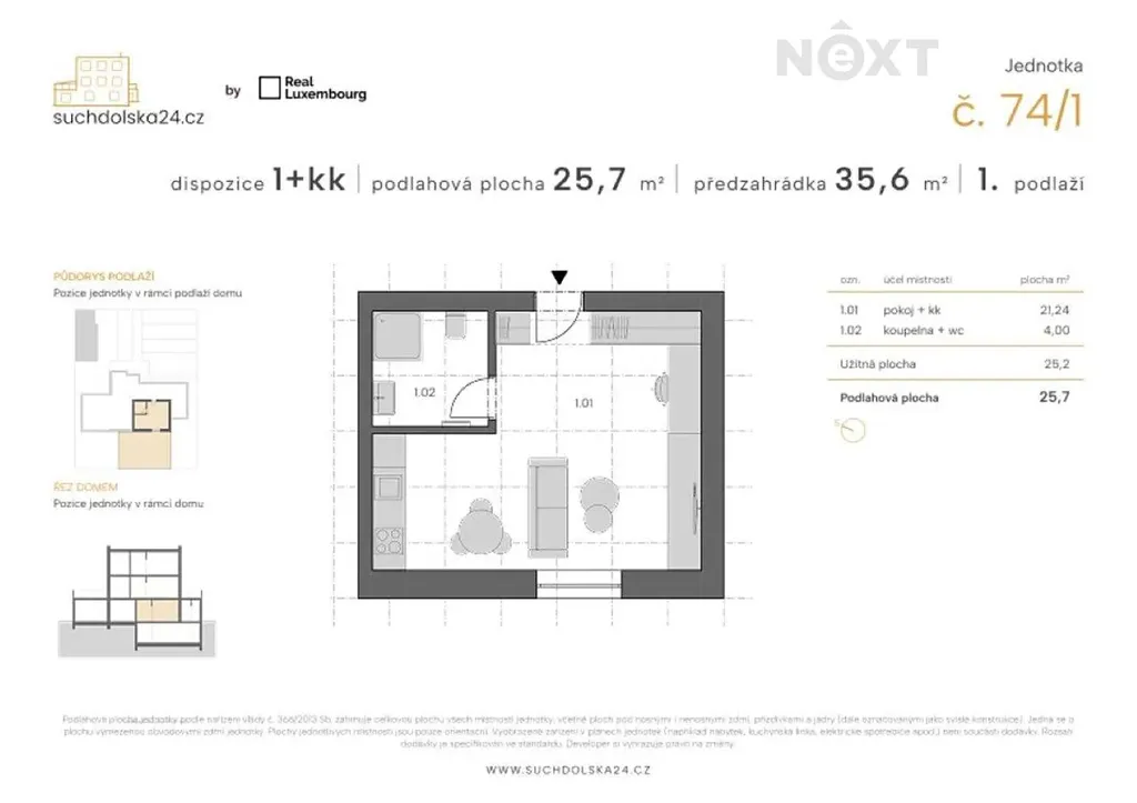 Jednotka se skládá z pokoje o ploše 21,4 m² a kompletně zařízenou novou koupelnou s toaletou a podlahovým vytápěním o ploše 4,0 m². K jednotce náleží zahrádka o ploše 35.6 m².
