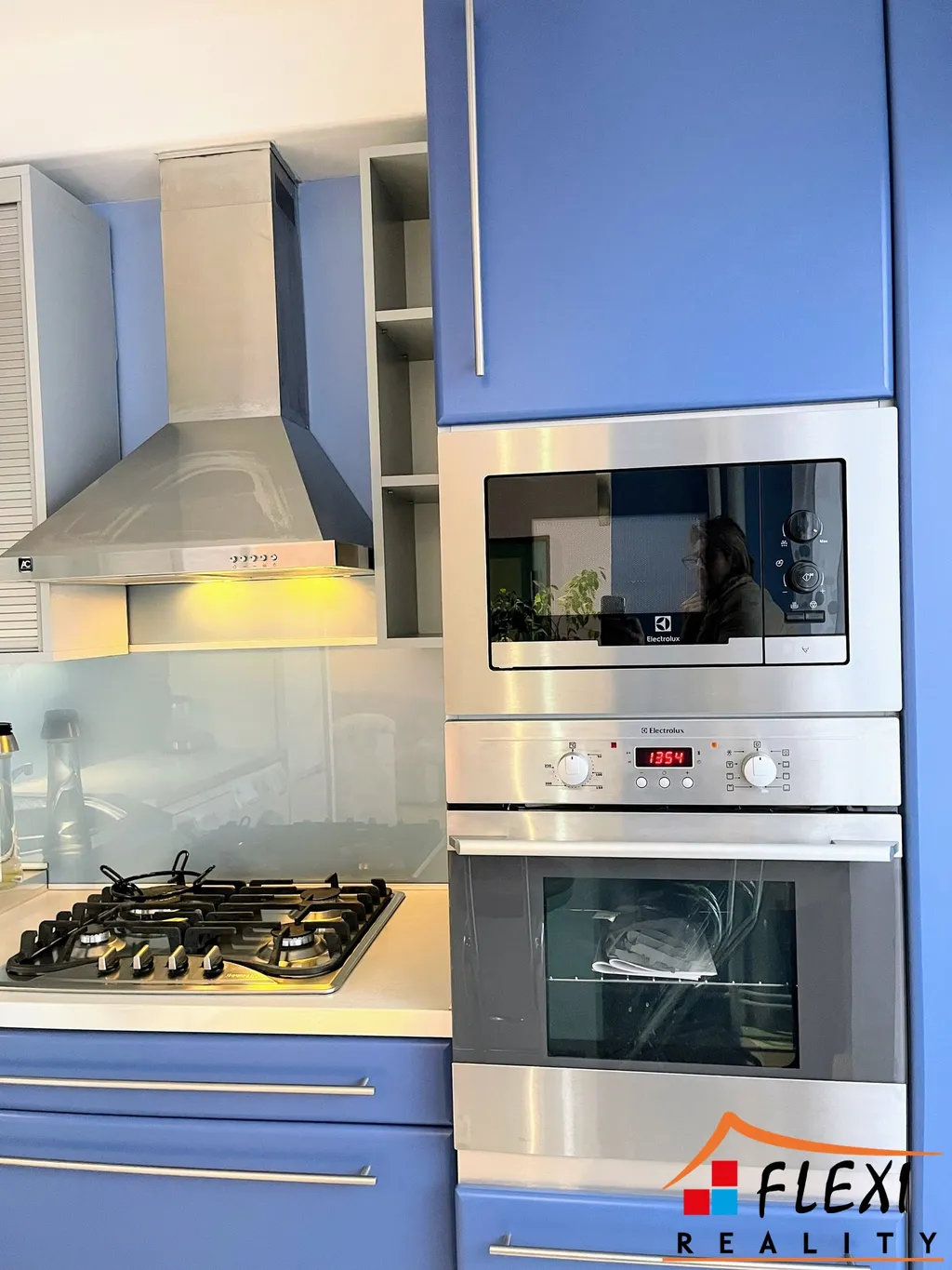 Byt se nachází v klidném domě ve 3p/17p se 2 výtahy. Kuchyňská linka na míru disponuje plynovou varnou deskou, digestoří, mikrovlnnou troubou, el. troubou s grilem, lednicí, myčkou, pračkou a barovým pultem s židlemi.