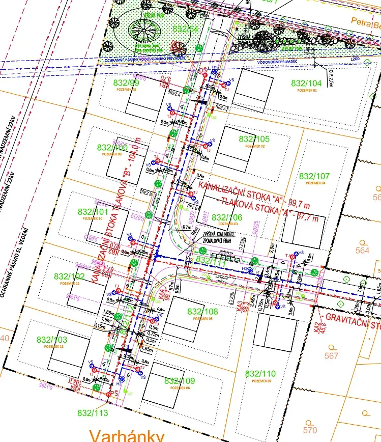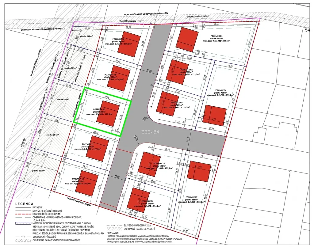 Nabízený pozemek má rozlohu 588 m² a nachází se v nové obytné zóně města. Je plně zasíťovaný – k dispozici je elektřina, vodovod i tlaková kanalizace, přičemž veškeré inženýrské sítě byly zkolaudovány v roce 2024. Přístup k pozemku je zajištěn po asfaltové komunikaci s veřejným osvětlením. Podle platného územního plánu je pozemek určen k individuálnímu bydlení (plocha BI), s maximální zastavitelností 30 % a možností výstavby dvou nadzemních podlaží a obytného podkroví.