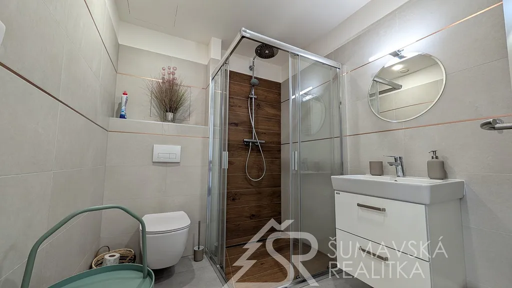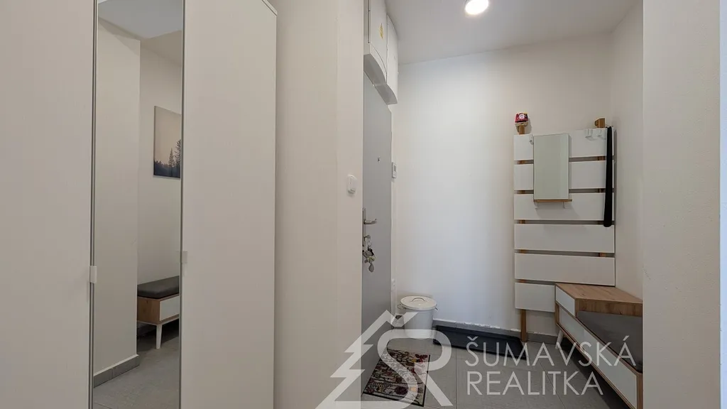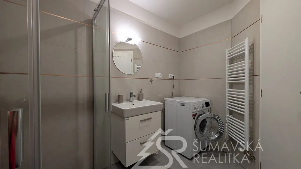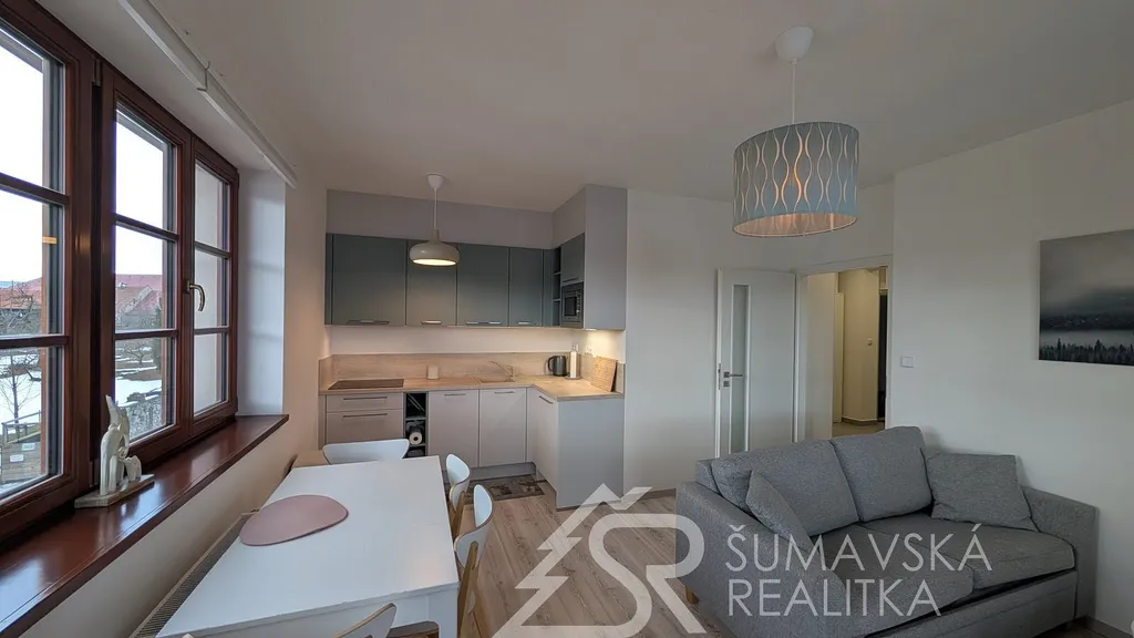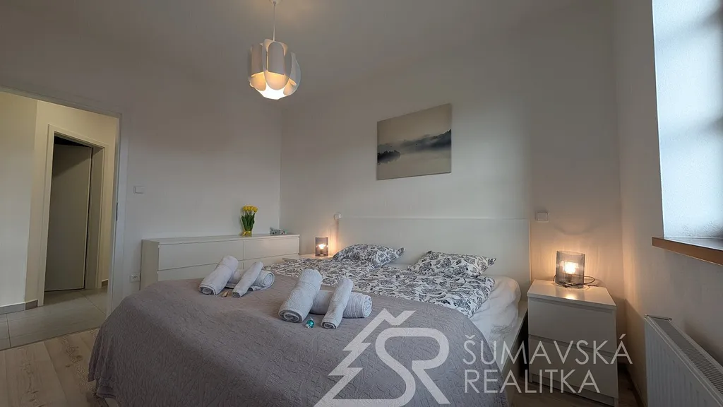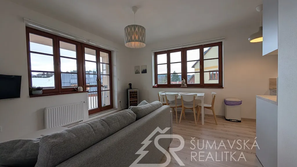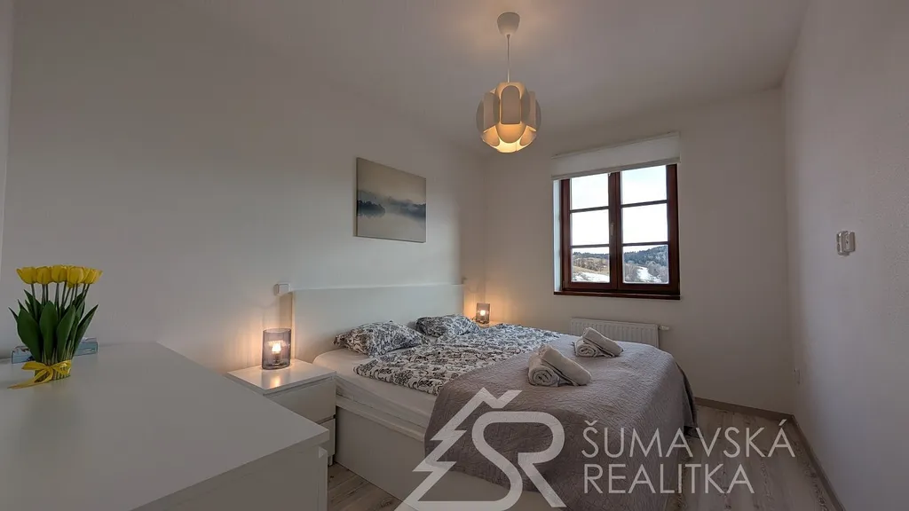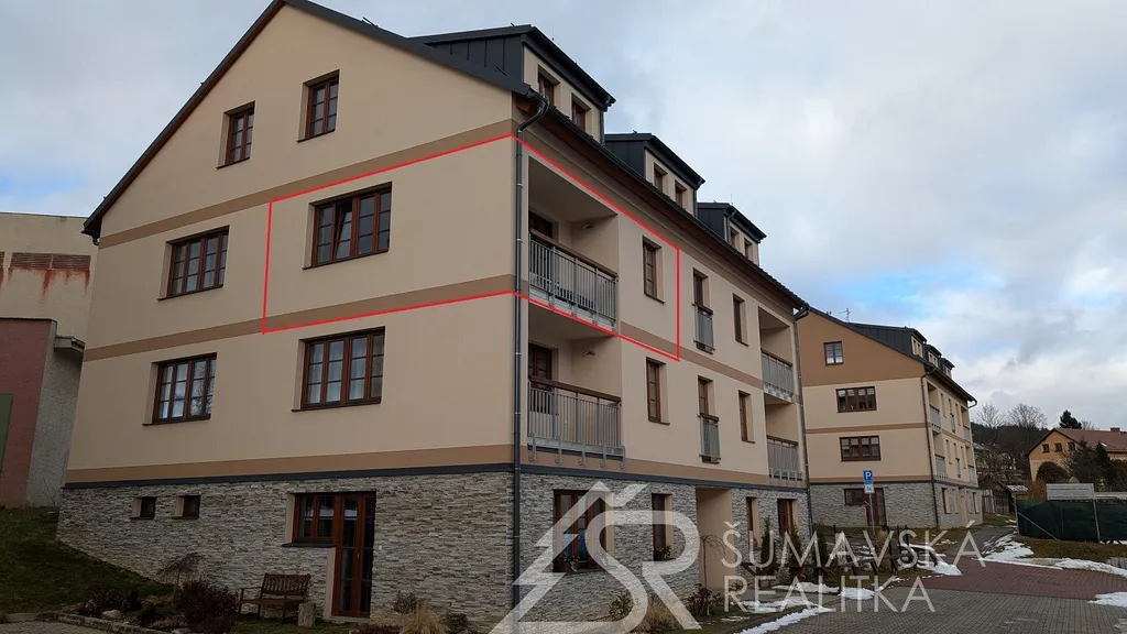 Popis: klasicky zděný bytový dům o 13 bytech byl realizovaný podle kvalitního autorského projektu arch. Radima Hucla. Je vybavený výtahem, v krásné poloze s výhledem na šumavská panoramata v jižně orientovaném pozemku, cca 2 min. pěší chůze od náměstí. Součástí bytu je i venkovní parkovacího stání. Komfortní byt je vybaven kvalitními standardy a výhodou je jižní balkón. Dům je připojen na městskou výtopnu biomasou, byt má samostatné měření tepla, vody a elektřiny. Jedná se o byt ve 2. NP o dispozici 2+kk a podlahové ploše 47 m². Z chodby vybavené skříní a botníkem jsou vstupy do prostorného a prosvětleného obývacího pokuje s velkou kuchyňskou linkou, jídelním stolem a sedací soupravou. Lodžie s orientací na jih poskytuje výhled na lyžařský areál i možnost pobytu na čerstvém šumavském vzduchu. Samostatná ložnice s jižním oknem může sloužit i jako dětský pokoj. Velkorysá je i koupelna se sprchovým koutem, závěsným WC a pračkou. K bytu je sklepní kóje v přízemí, společná kolárna a jedno soukromé parkovací stání u domu. Objekt je dokonale zateplen a s okny s izolačními trojskly poskytuje perfektní tepelnou pohodu s minimálními náklady na vytápění.
