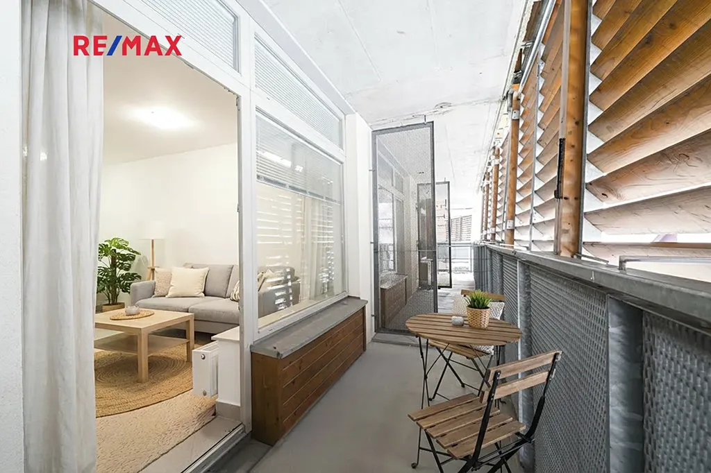 obývací pokoj (18,7 m²) s kuchyňským koutem (3,3 m²) a vstupem na balkón (5 m²)
