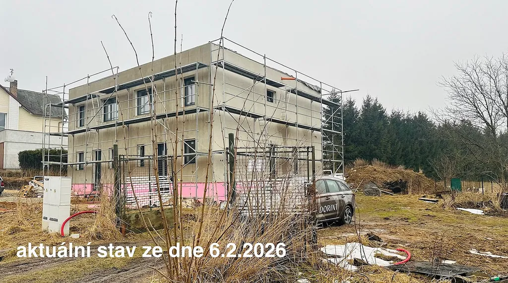 Harmonogram dokončení: únor 2026 – pokládka podlahových krytin v celém domě; březen 2026 – obklady a dlažby včetně kompletace koupelen, osazení interiérových dveří, finálním dokončení elektro; duben 2026 – přípojka vody, fasáda domu včetně terénních úprav – zámková dlažba, trávník, oplocení; květen - kolaudace domu. V interiéru budou použity kvalitní materiály / moderní šedo-bílý design s pečlivým a dokonalým provedením. Kuchyňská linka včetně spotřebičů, vestavěné skříně, venkovní rolety, krbová kamna, přístavek pro auto není zahrnut v ceně domu. V případě vašeho zájmu zašleme celý nabídkový list + kompletní projektovou dokumentaci.