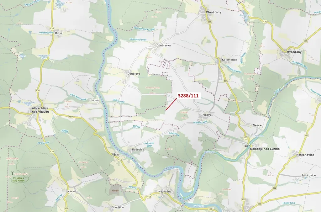 Lesní pozemek o výměře 978 m2, parcelní číslo 3288/111, podíl 1/1, katastrální území Hosty, obec Hosty, obec s rozšířenou působností Týn nad Vltavou, okres České Budějovice, Jihočeský kraj. Po těžbě.