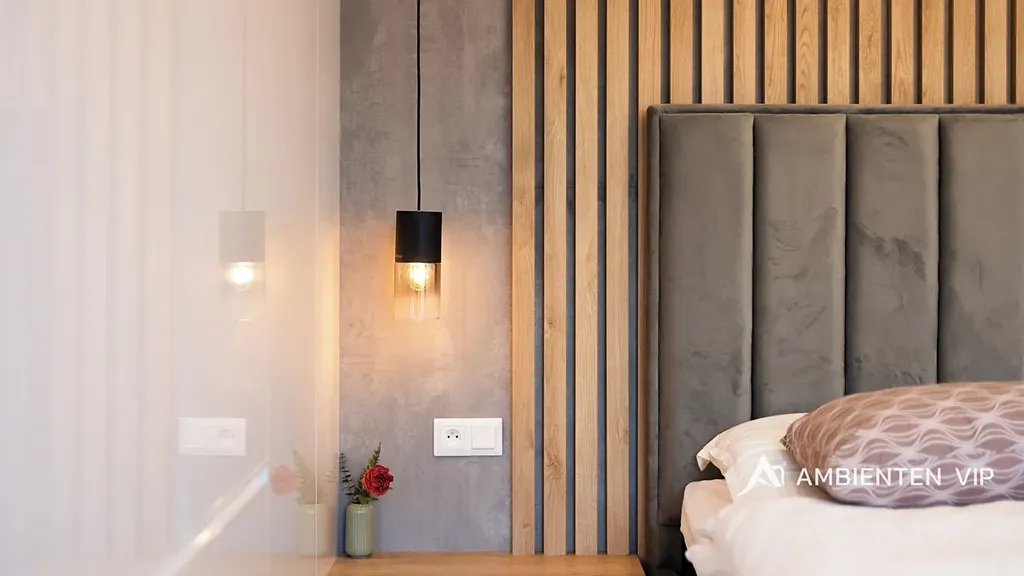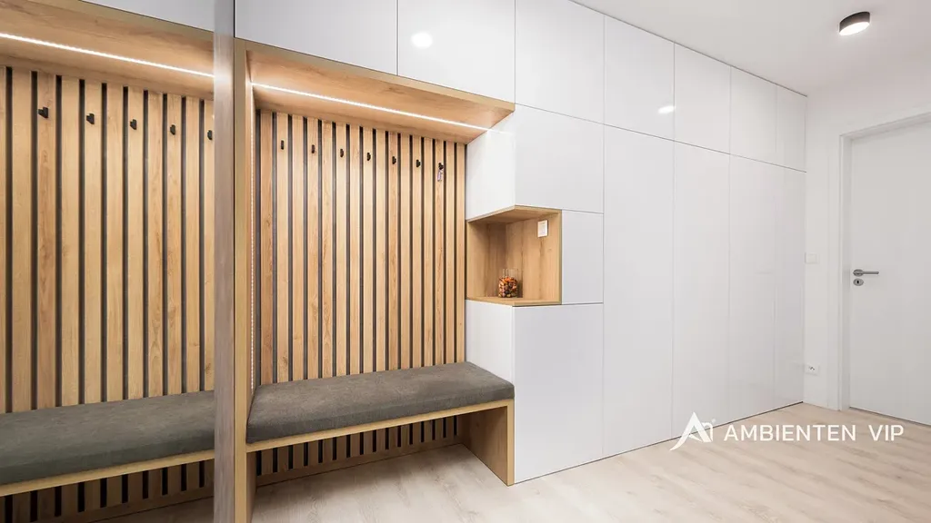 Ložnice nabízí nejen klid a soukromí, ale také dostatek úložných prostor v podobě designových vestavěných skříní. Dámy jistě ocení stylový toaletní stolek se zrcadlem, který je elegantní i praktickou součástí interiéru. Další úložné prostory jsou chytře řešeny také v předsíni a koupelně, takže byt působí vzdušně a organizovaně.