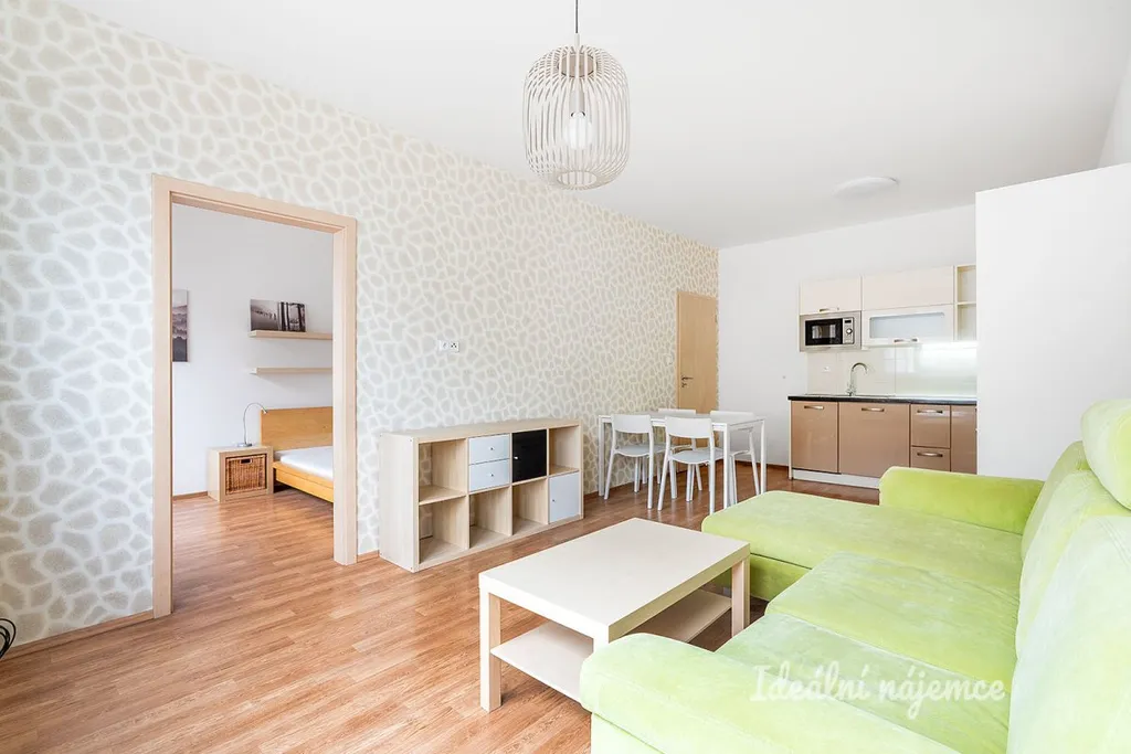 Interiér je nabízen jako částečně vybavený, což budoucím nájemníkům umožňuje doladit si domov podle vlastního vkusu. Srdcem bytu je obývací pokoj s plně vybaveným kuchyňským koutem, kde nechybí moderní spotřebiče jako myčka, lednice s mrazákem, elektrická a mikrovlnná trouba či varná deska. Součástí této místnosti je také jídelní kout, pohodlná sedací souprava a konferenční stolek s úložným prostorem. Samostatná ložnice poskytuje dostatek soukromí a koupelna je vybavena vanou, pračkou i toaletou.