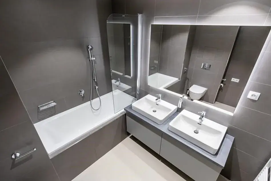 Byt se vyznačuje vysokým standardem provedení a kvalitními materiály: předokenní žaluzie, dřevěná okna s izolačními trojskly, velkoformátové obklady a dlažby v koupelnách, dvě toalety, sanita Laufen Pro, bidetové sprchy, dubové podlahy s podlahovým vytápěním, nadstandardní výška interiérových dveří 2,1 m, videotelefon a čipový systém vstupu do budovy.