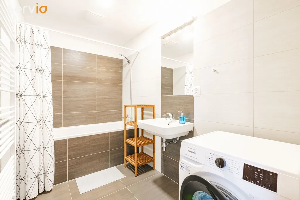 Ve výhradním zastoupení majitele nabízíme k prodeji novostavbu prostorného bytu 3+kk na ulici Kigginsova, v Brně - Slatině, se soukromou zahrádkou v osobním vlastnictví, o celkové užitné ploše 176 m2 (z toho zahrada 91 m2). Byt o ploše 80 m2 je umístěn v 1. NP cihlového domu s bezbariérovým přístupem a jeho součástí je sklep (cca 5 m2) a kryté parkovací stání v 1.PP domu kolaudovaného v roce 2017. V domě je výtah, kolárna - kočárkárna. Sklep se nachází v blízkosti bytu na stejném podlaží. Při vstupu do bytu je prostorná vstupní chodba, samostatné WC s umyvadlem, z chodby navazuje vstup do obytné části bytu, kde je umístěna kuchyně s jídelní částí. Byt se prodává částečně zařízený. KL včetně spotřebičů (indukce Bosch, el. trouba Whirlpool, nová digestoř, myčka a pračka Gorenje). Ostatní nábytek dle foto. Od jídelního stolu je krásný výhled do soukromé zahrádky, která je součástí bytu a vstup na ni je z obývací části navazující na kuchyň s jídelní částí. V zadní částí za kuchyní je ložnice. Vedle obývací části se nachází prostorná koupelna s vanou, místem pro pračku a za koupelnou je vstup do dalšího pokoje (může být pracovna, dětský pokoj, druhá ložnice). Byt je velmi hezky dispozičně řešený a prosvětlený, výhodou je soukromá zahrádka s terasou z dlažby a trávníkem, vývod na vodu a el. zásuvka, soukromí zajišťují ozdobné gabiony.