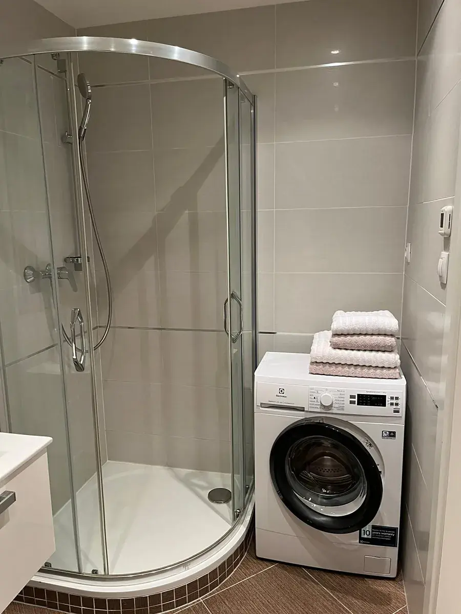 Koupelna je vedena společně s toaletou a je vybaven prostorným sprchovým koutem, skříňkou pod umyvadlem. Dostatečný prostor je pro širokou pračku, která je také součástí pronájmu a je již k dispozici. Ve vstupní chodbě je velká šatní skříň se zrcadlem a vestavný botník.