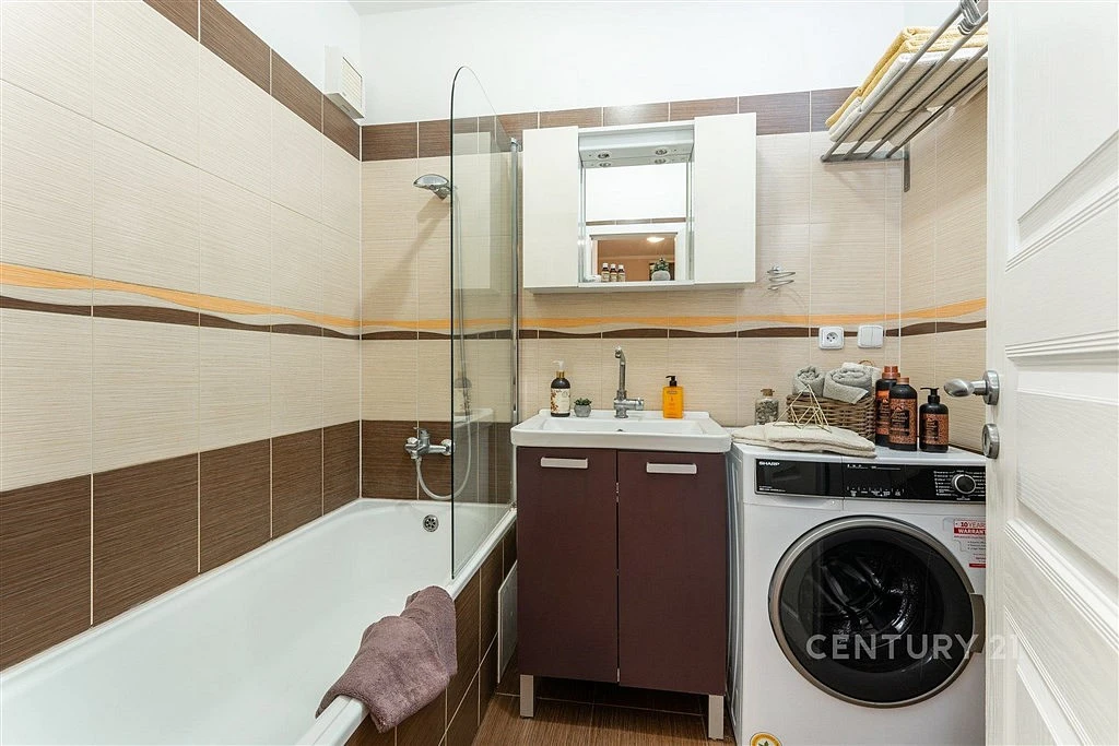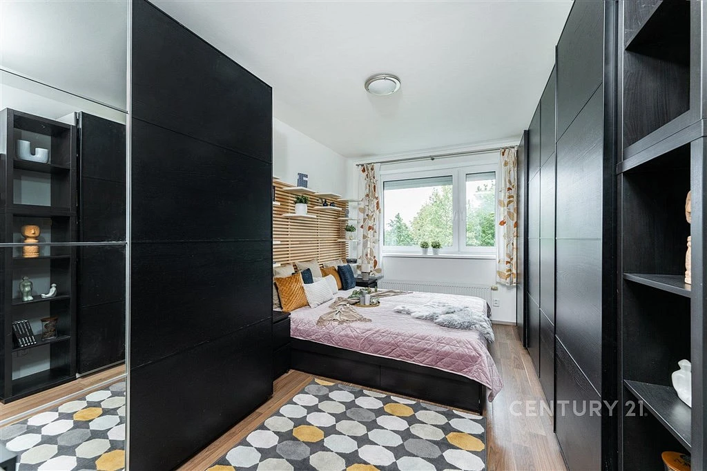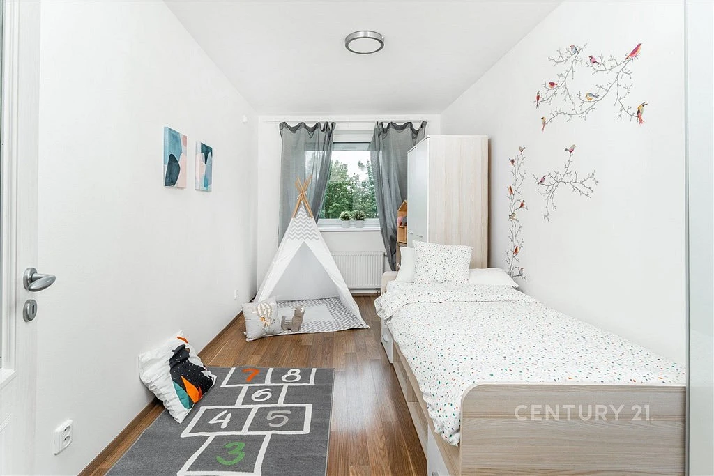 Všechny místnosti jsou zařízené, stačí se jen nastěhovat a uložit věci na své místo. V obývacím pokoji je vám k dispozici TV stěna, rozkládací stůl s židlemi i pro návštěvy, v ložnici spousta úložného prostoru v několika skříních i v posteli 200x180 s rošty a nočními stolky. Druhá ložnice je koncipovaná jako dětský/studentský pokoj, pracovna či pokoj pro hosty. Z obou pokojů je výhled, jaký v hustě osídlených lokalitách Prahy jen tak nenajdete: do parkové zeleně a sadu. Tyto pozemky náleží k domu a jsou výtečnou alternativou zahrady.