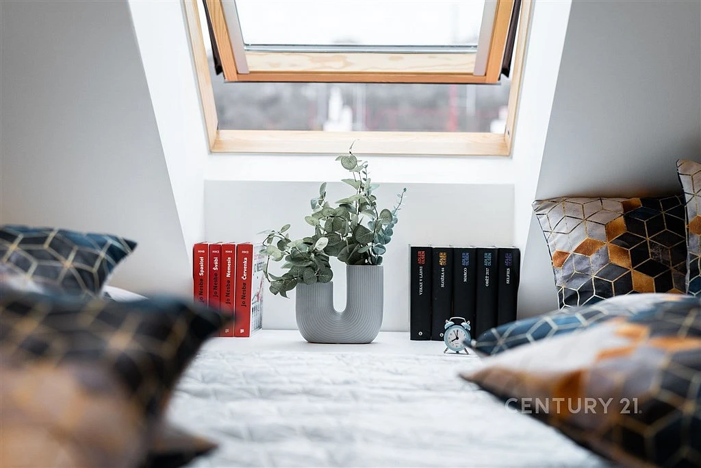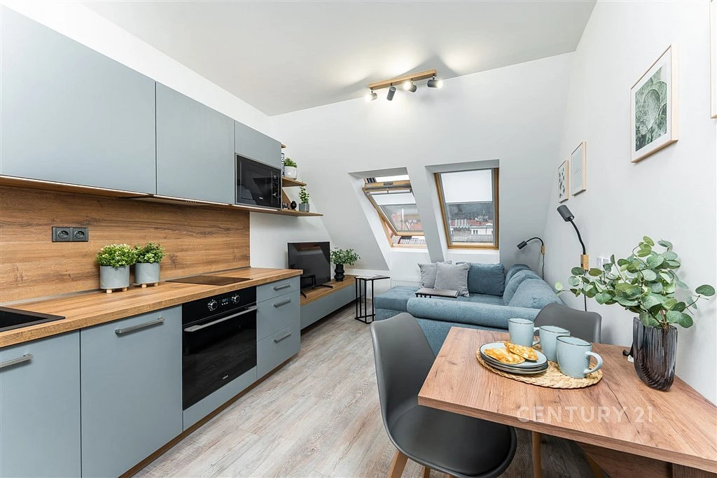Je kompletně vybaven a zařízen: kuchyňská linka na míru včetně vestavěných spotřebičů (vysoká lednice s mrazákem, indukční varná deska, mikrovlnka, trouba, digestoř, myčka nádobí), jídelního stolu, židlí, sedačky, TV skříňky, vestavěnou skříní s pračkou a samostatnou sušičkou v předsíni, pracovním koutem, vestavěnými skříněmi a postelí box spring v ložnici.